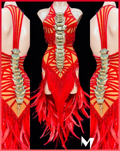 [PRE-OWNED] Red and Gold Feather Dress #S393