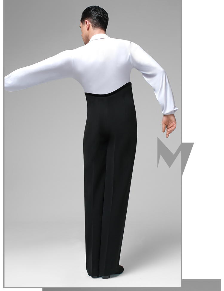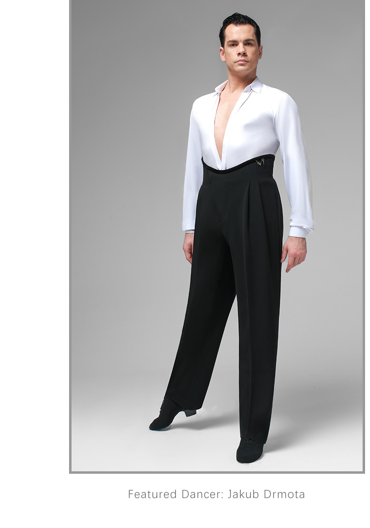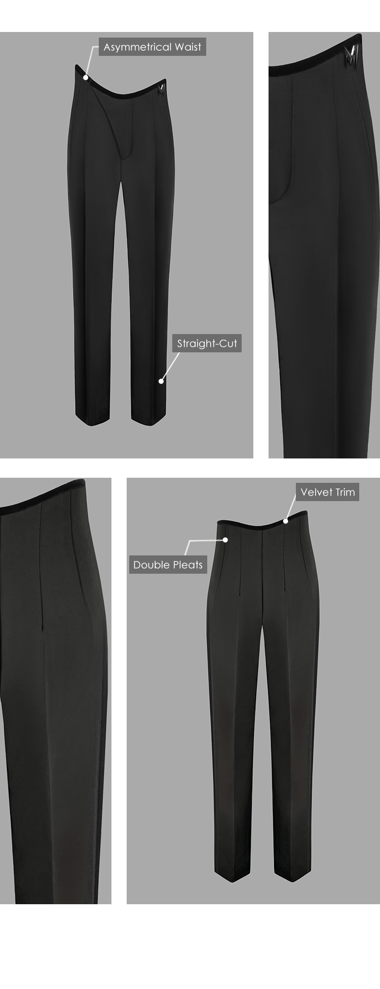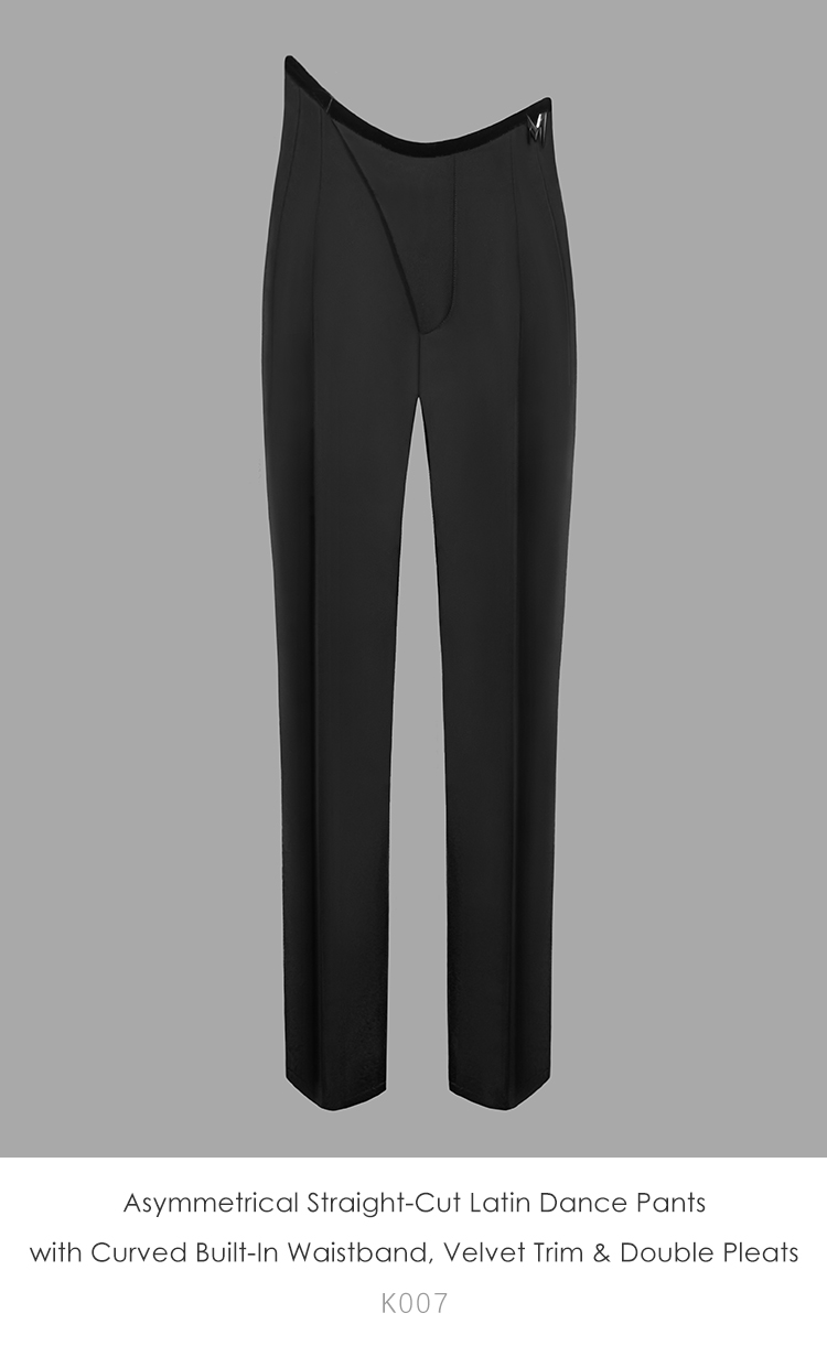 Asymmetrical Straight-Cut Latin Dance Pants with Curved Built-In Waistband, Velvet Trim & Double Pleats #K007