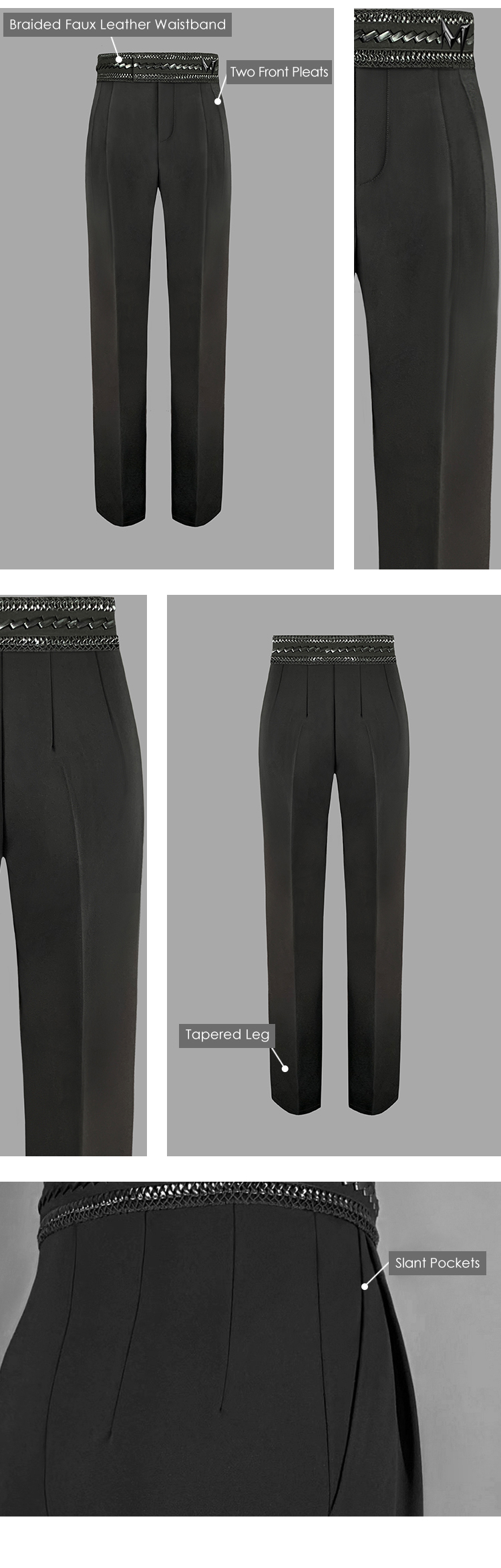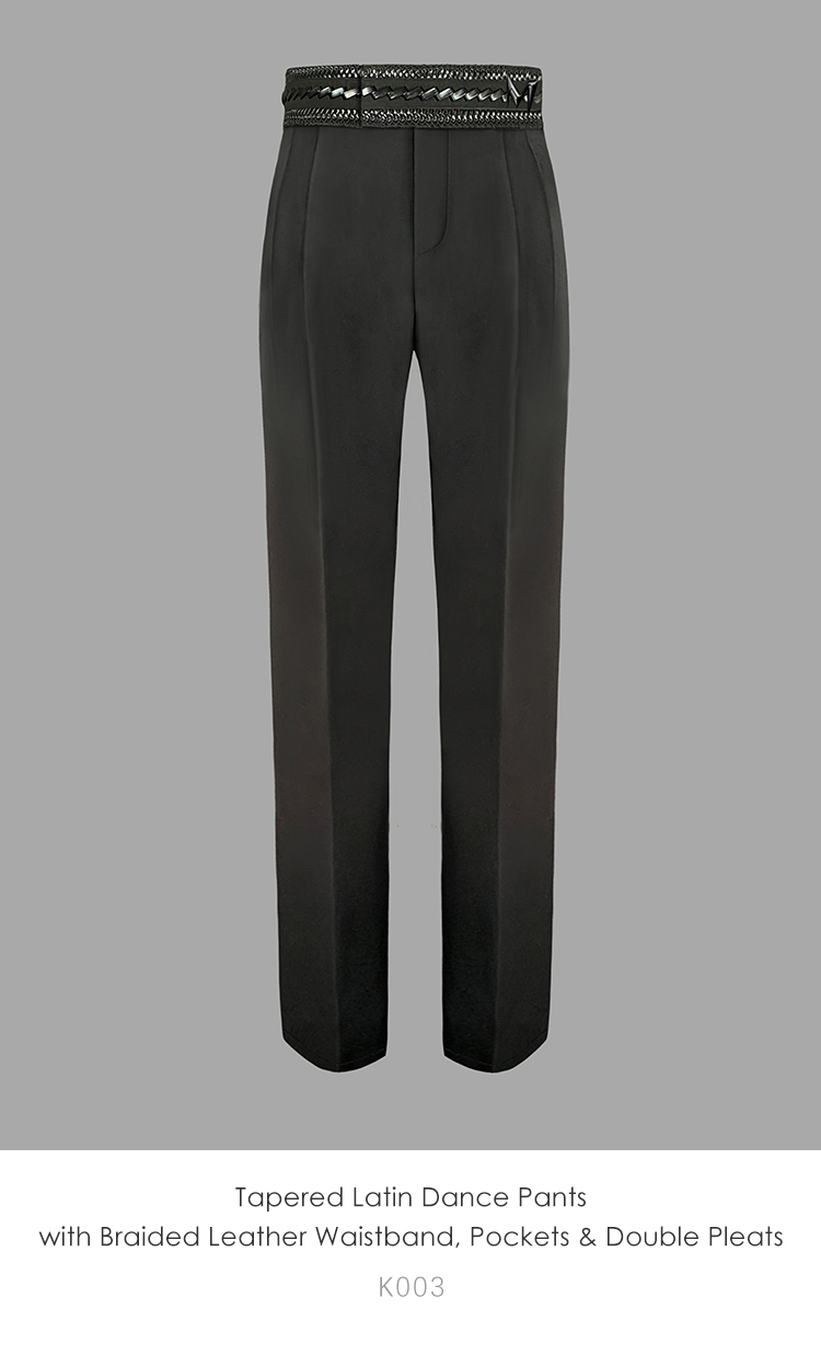 Tapered Latin Dance Pants with Braided Leather Waistband, Pockets & Double Pleats #K003
