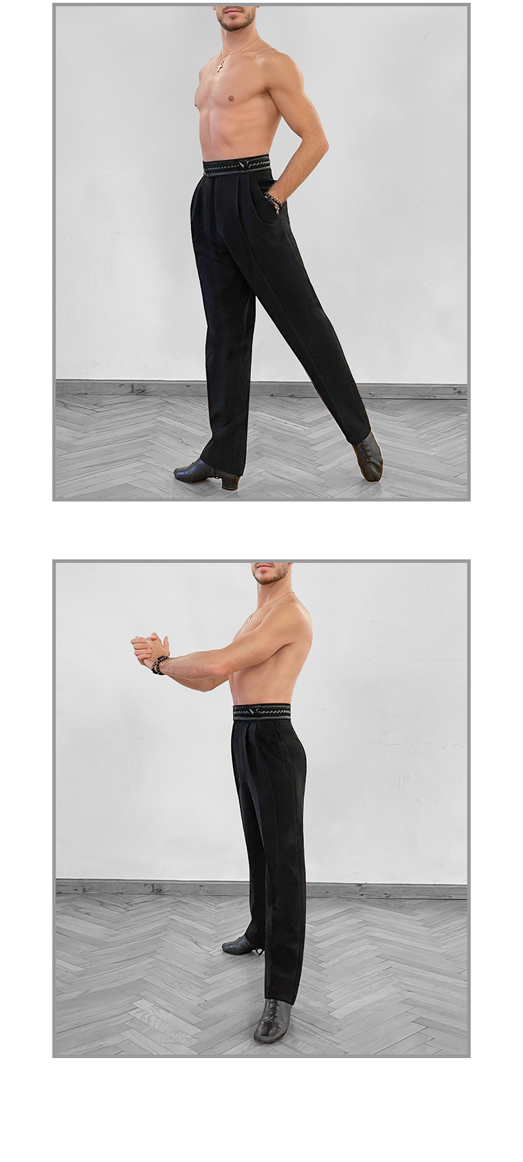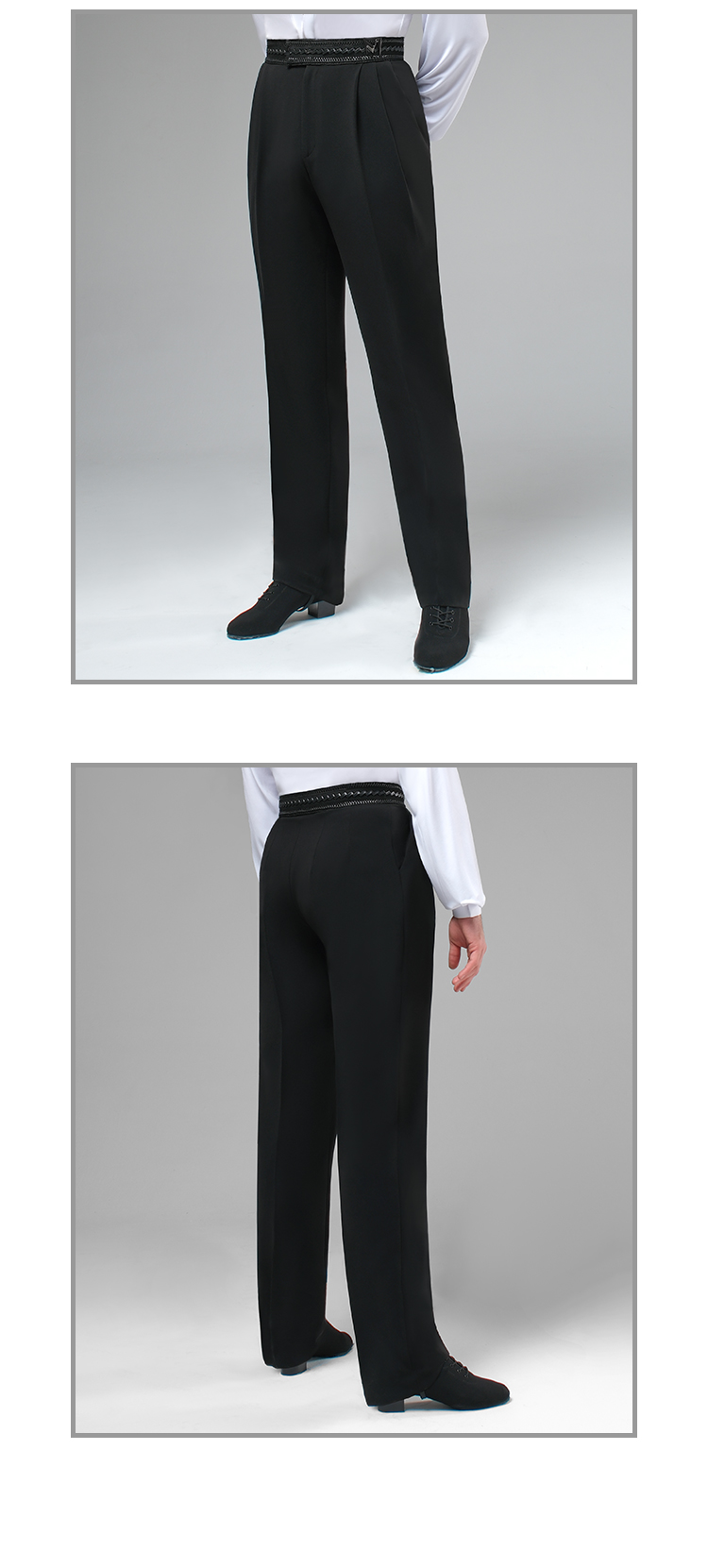 Tapered Latin Dance Pants with Built-In Waistband, Extended Strap Tab, Decorative Buckle & Double Pleats #K008