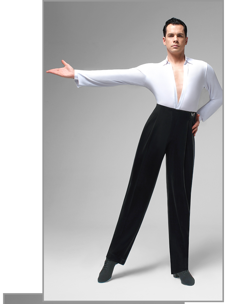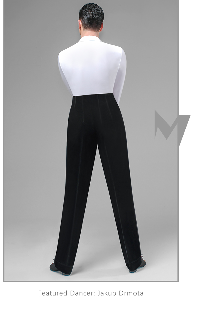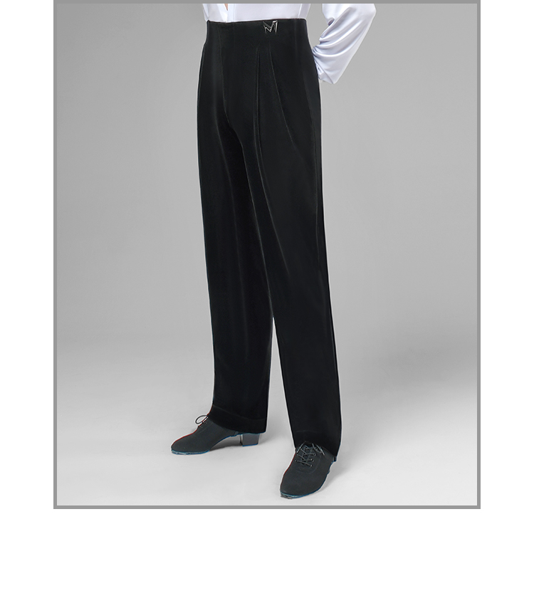 Asymmetrical Straight-Cut Latin Dance Pants with Curved Built-In Waistband, Velvet Trim & Double Pleats #K007